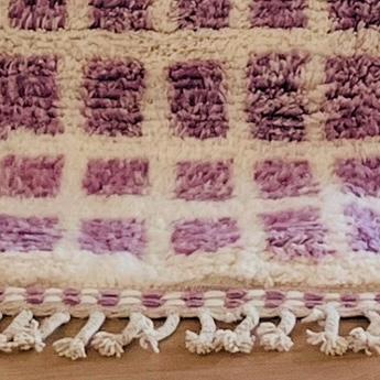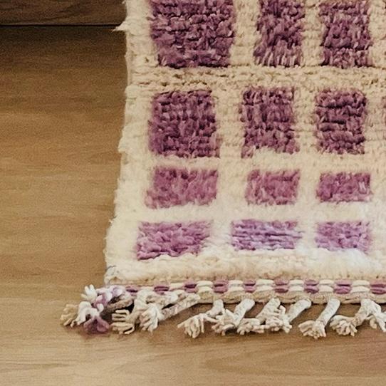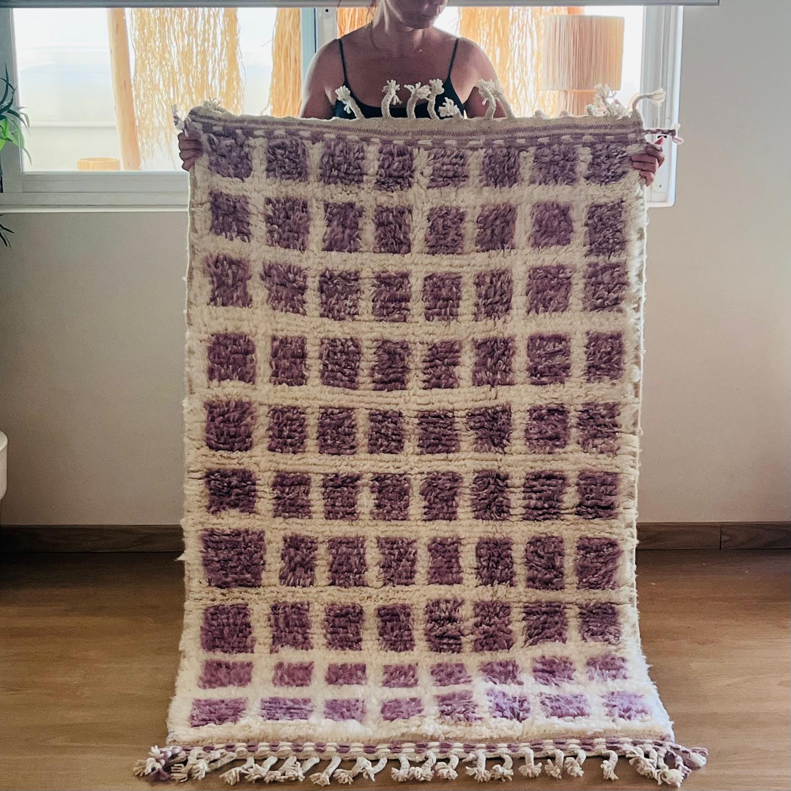 Su patrón en cuadros malva evoca armonía y calma, convirtiendo cualquier rincón en un refugio cálido y acogedor. Una auténtica Beni Ourain de alta calidad, única e irrepetible, que lleva a tu hogar la belleza de lo artesanal y el valor de lo hecho con alma.
