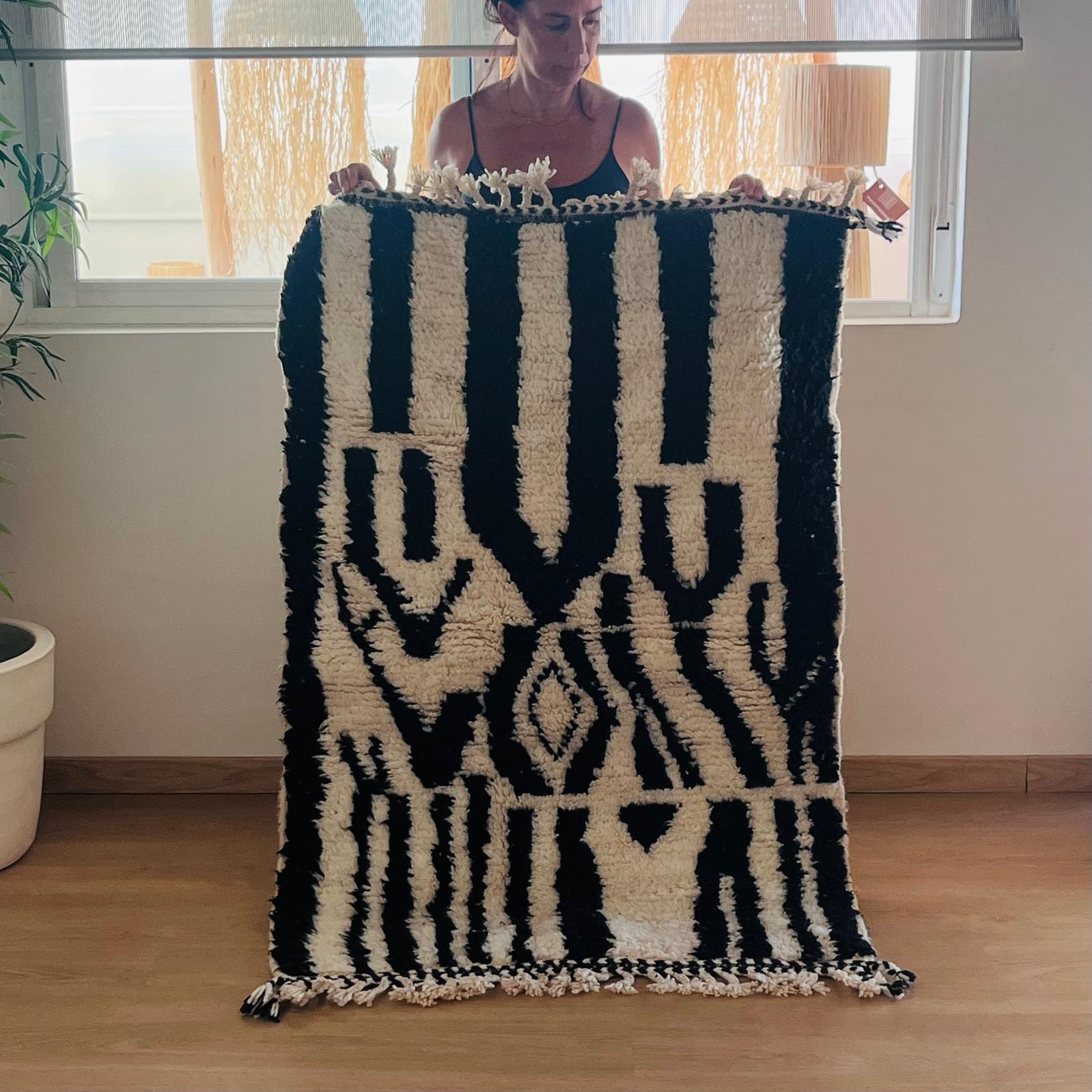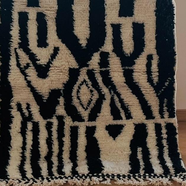 Elaborada en lana de oveja natural, combina con elegancia el blanco y el negro en un diseño de caminos abstractos que llenan de carácter cualquier espacio.