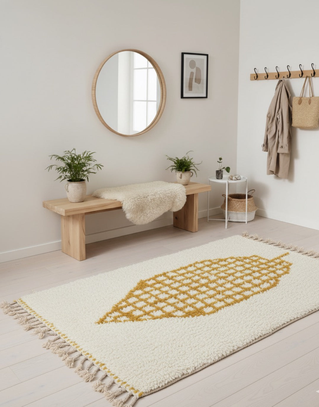 Obra artesanal tejida a mano en las montañas del Atlas, donde cada puntada refleja la paciencia y el saber ancestral de las artesanas bereberes.