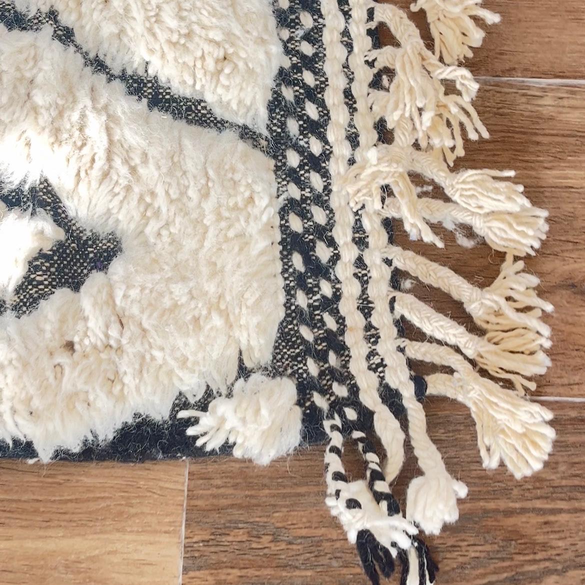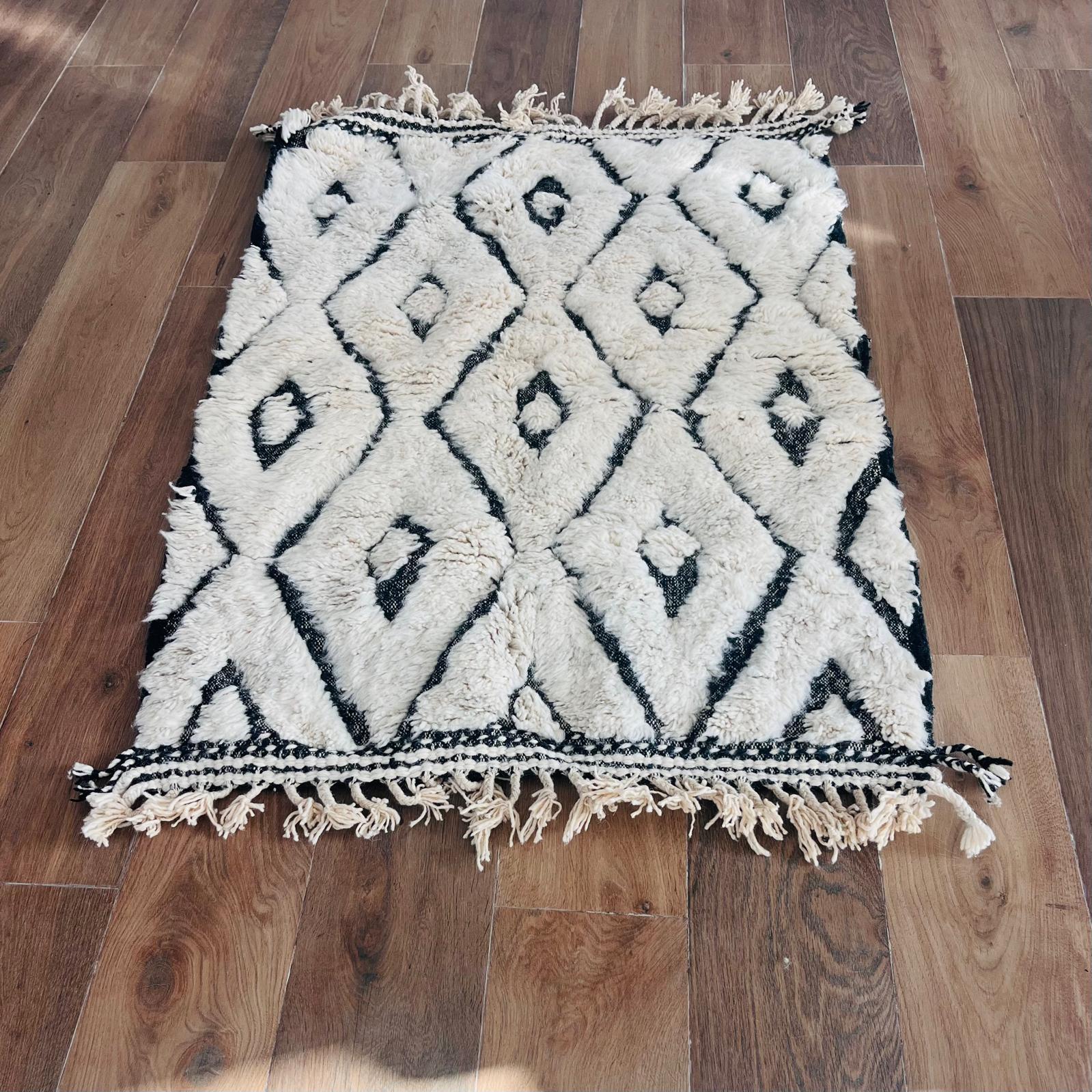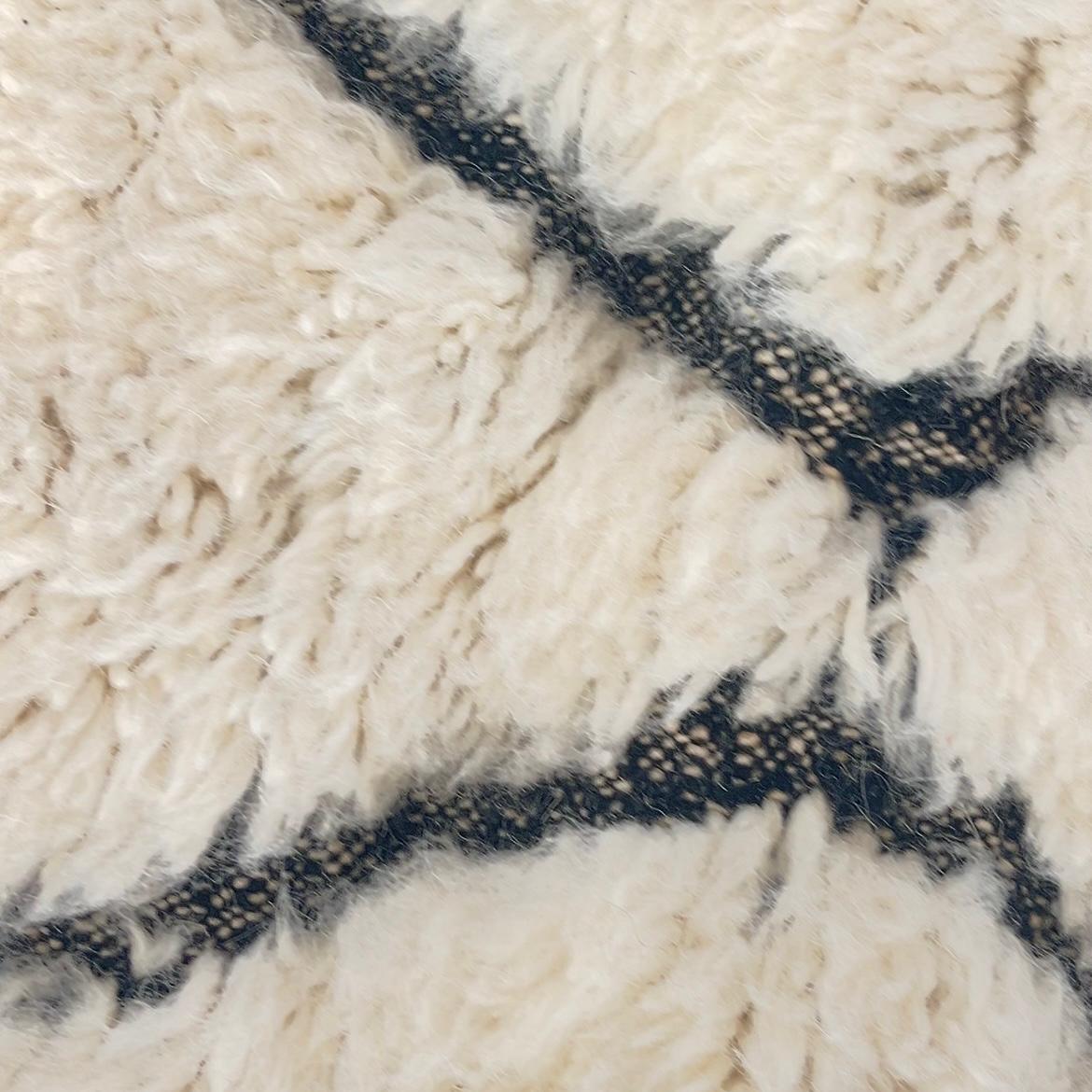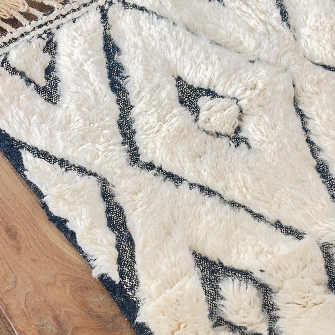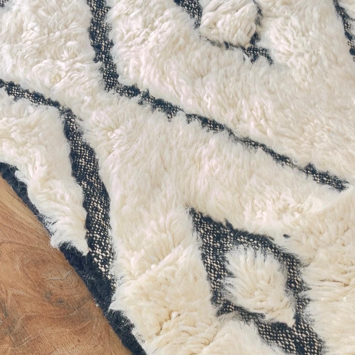 Esta alfombra Beni Ourain ha sido tejida a mano por mujeres bereberes del Alto Atlas, utilizando lana virgen 100 % natural. Su base blanca y luminosa se entrelaza con rombos negros que no solo decoran: cuentan historias.
